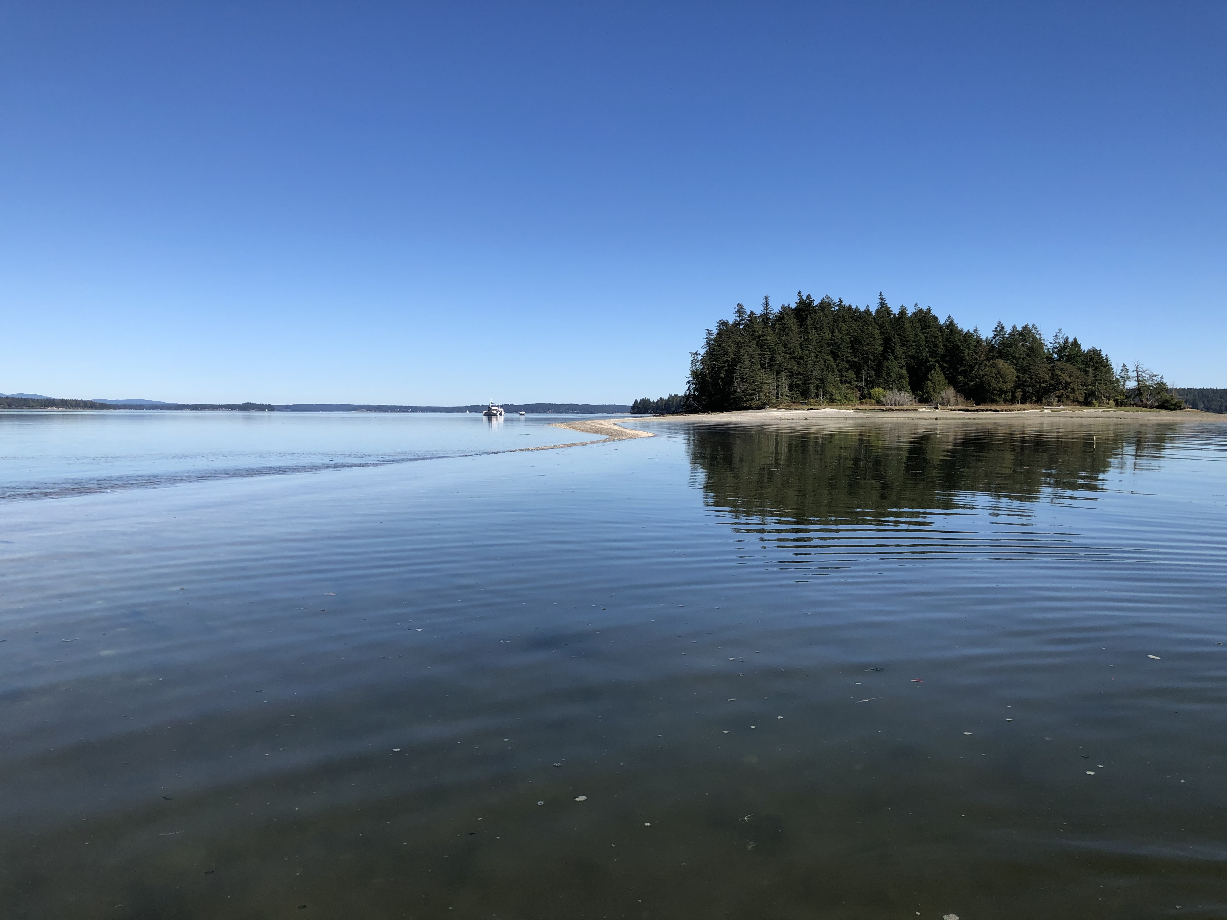 In late-September, we again provisioned Scat! and headed north through Budd Inlet. Our objective for this trip was McMicken Island. Once through Dana Passage, we headed further north into Case Inlet. McMicken Island is a real gem! Its located just east of Harstine Island, and during low tide, McMicken is connected to Harstine via a narrow spit of sand. This tiny land bridge, known as a tombolo, disappears during high tide.